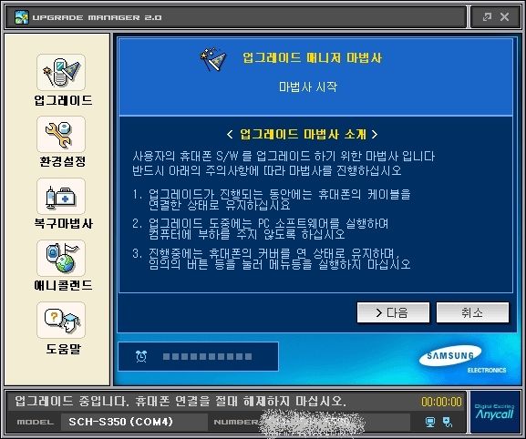 삼성 애니콜에서는 얼마전 부터 사용자가 자신의 핸드폰 펌웨어를 온라인으로 업데이트 할 수 있는 업그레이드 매니저라는 것을 발표 했습니다.