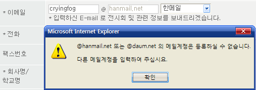 메일을 쓰는 곳에 한메일을 선택할 수 있게 되어 있는데, 막상 등록을 하려고 하면 위의 그림처럼 @hanmail.net이나 @daum.net의 메일을 사용할 수 없게 되어 있네요. 예전 다음이 온라인 우표제를 할 당시 온라인 우표제를 반발한 많은 기업들이 hanmail 계정에 대해서 사용할 수 없게 조치를 취했는데 2005년 6월 폐지가 되었음에도 불구하고 많은 사이트들이 아직도 한메일 사용자들의 편의를 무시 하고 있는 실정입니다.