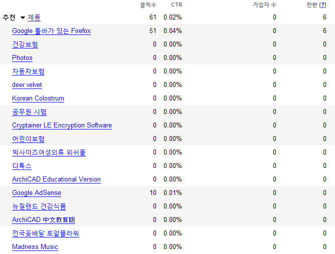 결과가 웃기게 나와서 한번 올려 봤습니다. 혹시 이글을 읽으시는 분들중에서 추천 프로그램(Firefox와 Adsense를 제외한)의 전환율이 나오시는 분들이 있으신가요???