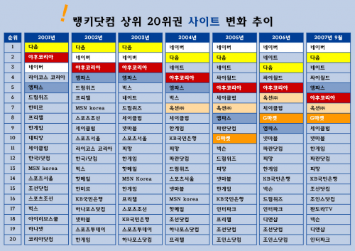 랭키닷컴에서 2001년 부터 2007년 9월까지의 인터넷 사이트 순위 변화에 대해서 분석 발표를 했습니다.