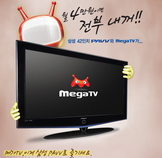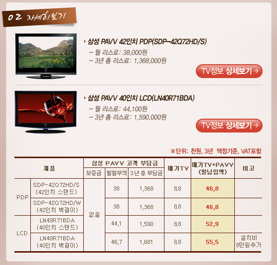 역시 또 간단하게 설명을 하면, 저 결합상품은 메가TV 3년 약정 가입자에게 삼성전자 40"대의 LCD/PDP TV를 할부형식으로 제공한다라는 것입니다.