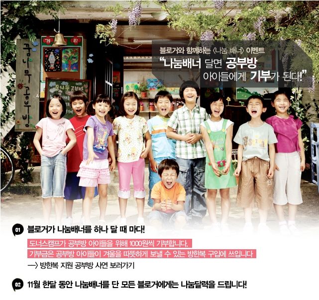 도너스캠프가 후원하는 것으로 블로거가 해당 배너를 달면 도너스 캠프에서 한 블로그당 1000원씩을 신청한 공부방에 지원을 해 주는 것입니다.