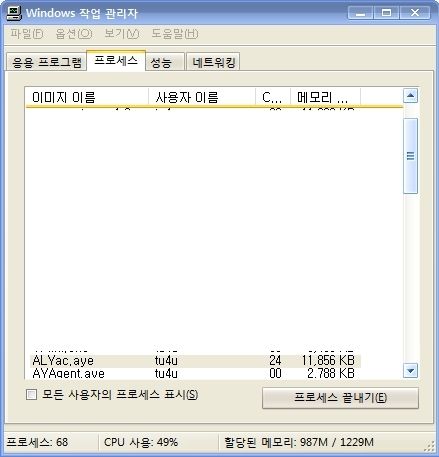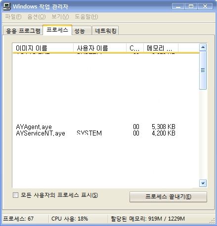 마지막으로 "실시간 감시" ON 상태의 시스템 리소스 점유율 입니다.