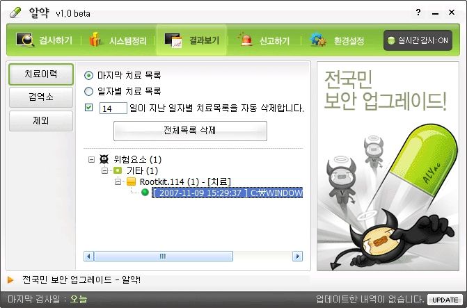 그나저나 테스트를 진행한 컴퓨터에는 V3가 깔려 있는데요. 그동안 그놈은 뭐했나 모르겠습니다. -_- 시킨 바이러스 감시는 안하고, 뭘 한걸까요?? 흠흠