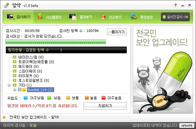 아마도 바이러스 백신 시장은 이제 B2C는 거의 없어질 것 같습니다. 제가 집에서 열심히 사용중인 "AVAST"나 이렇게 새로운 "알약" 같은 것이 무료로 뿌려 지니까 말이에요. B2B 시장에 올인해야 할때가 아닌가 합니다. 앞으로 다른집에 바이러스 백신 깔아주러 갈때는 이 알약을 깔아 줘야 겠습니다. AVAST는 뭐랄까 좀 어렵다는 생각이 들어서요. 여기저기를 돌아다니면서 보니 알약의 엔진은 외국 바이러스 엔진이라고 합니다. 뭐.. 성능 인정 받은 것 중에서 하나 들여 온 것이겠지요.