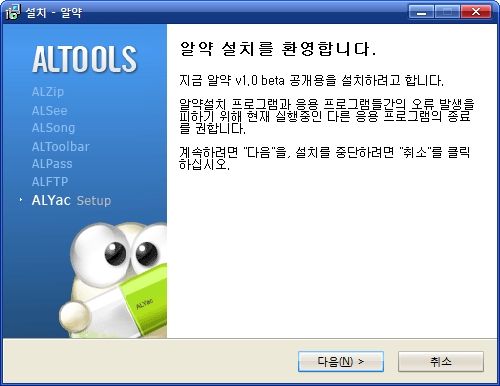 우선 아이콘과 이미지의 캐릭터는 전형적으로 알소프트웨어의 알(?)이 알약을 들고 있는 모습입니다. 설치 파일의 크기는 21.9M(23,047,896 바이트) 입니다.